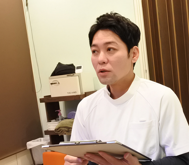 施術を受けていただく前に、お身体の状態を丁寧にチェックします。 現在、ご自身のお身体がどのようになっているかを一緒に確認しながら進めます。 肩の高さや骨盤の位置、足や手の長さ差異などを確認します。 また、身体を左右にねじったり、背中を反ったときに動かしにくい箇所があるかなどのチェックします。 身体チェックの後、お身体の悩みや痛みがなぜ生じているかをご説明します。 - Step04